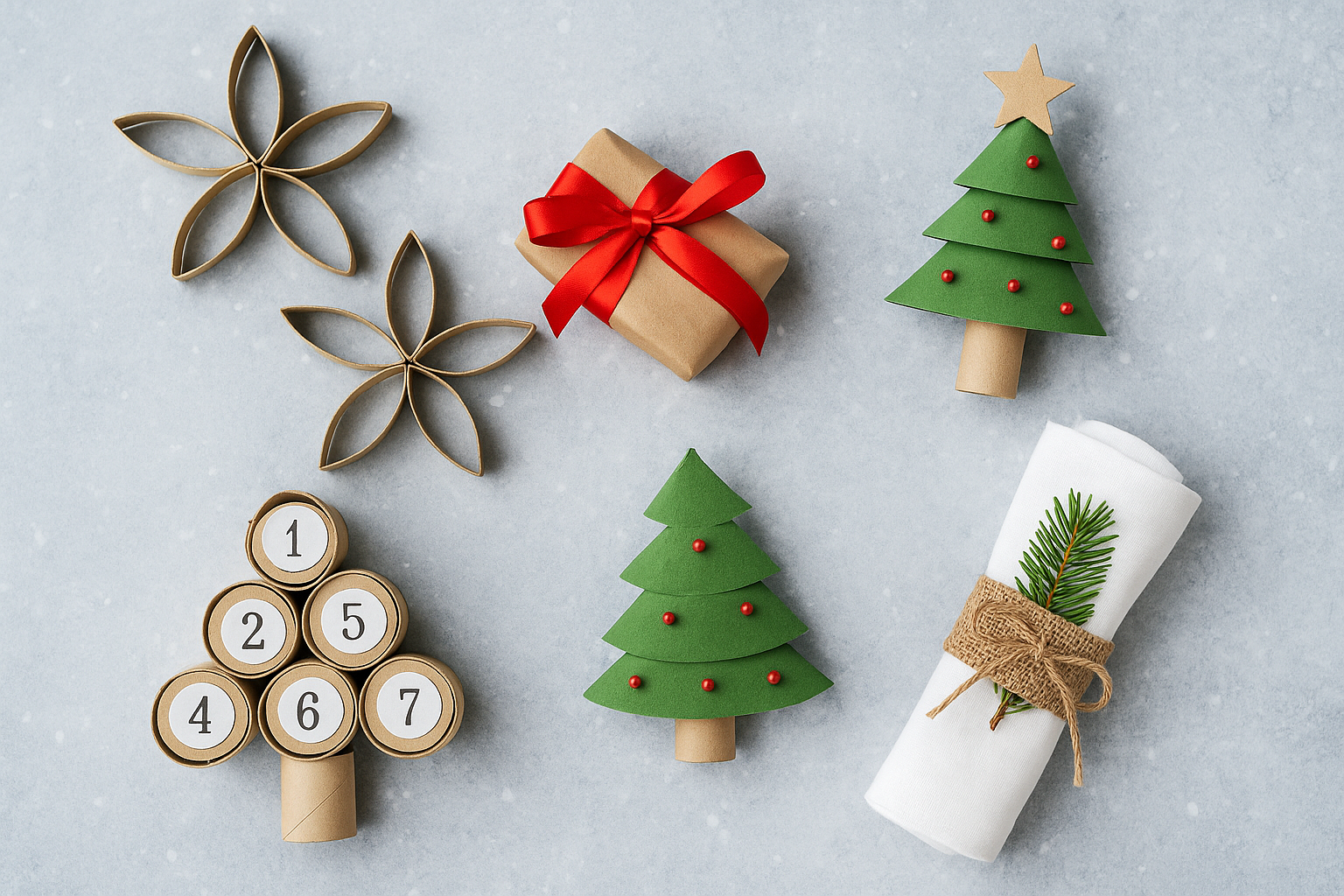 Za stolnu dekoraciju, možete napraviti mini božićna drvca. Tuljak se koristi kao stabilna baza, a kartonske grančice ili izrezani oblici slažu se prema gore, stvarajući oblik mini bora. Dodavanjem boje, ukrasnih perlica ili svjetlucavih detalja, dobit ćete preslatke dekoracije koje mogu krasiti vaš blagovaonski stol ili radni kutak. Ove male božićne jelke, izrađene od recikliranih materijala, bit će savršene za dodavanje topline i svečanosti prostoru.