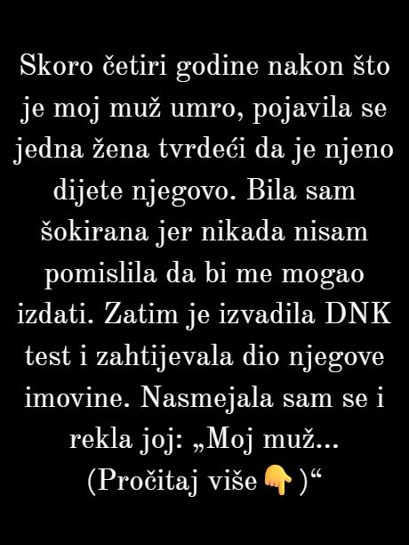 Nakon smrti supruga, ova žena prolazila je kroz najteže trenutke svog života, suočena s tugom i gubitkom. Međutim, nekoliko mjeseci nakon sprovoda, otkrila je nešto što ju je potpuno potreslo — njen muž je imao dijete iz vanbračne veze, o kojem ona nije imala pojma. Ta spoznaja donijela je emocionalni šok, duboku povrijeđenost i osjećaj izdaje. Kako se nositi s činjenicom da je osoba koju je voljela cijeli život imala dijete koje joj je bilo potpuno nepoznato?