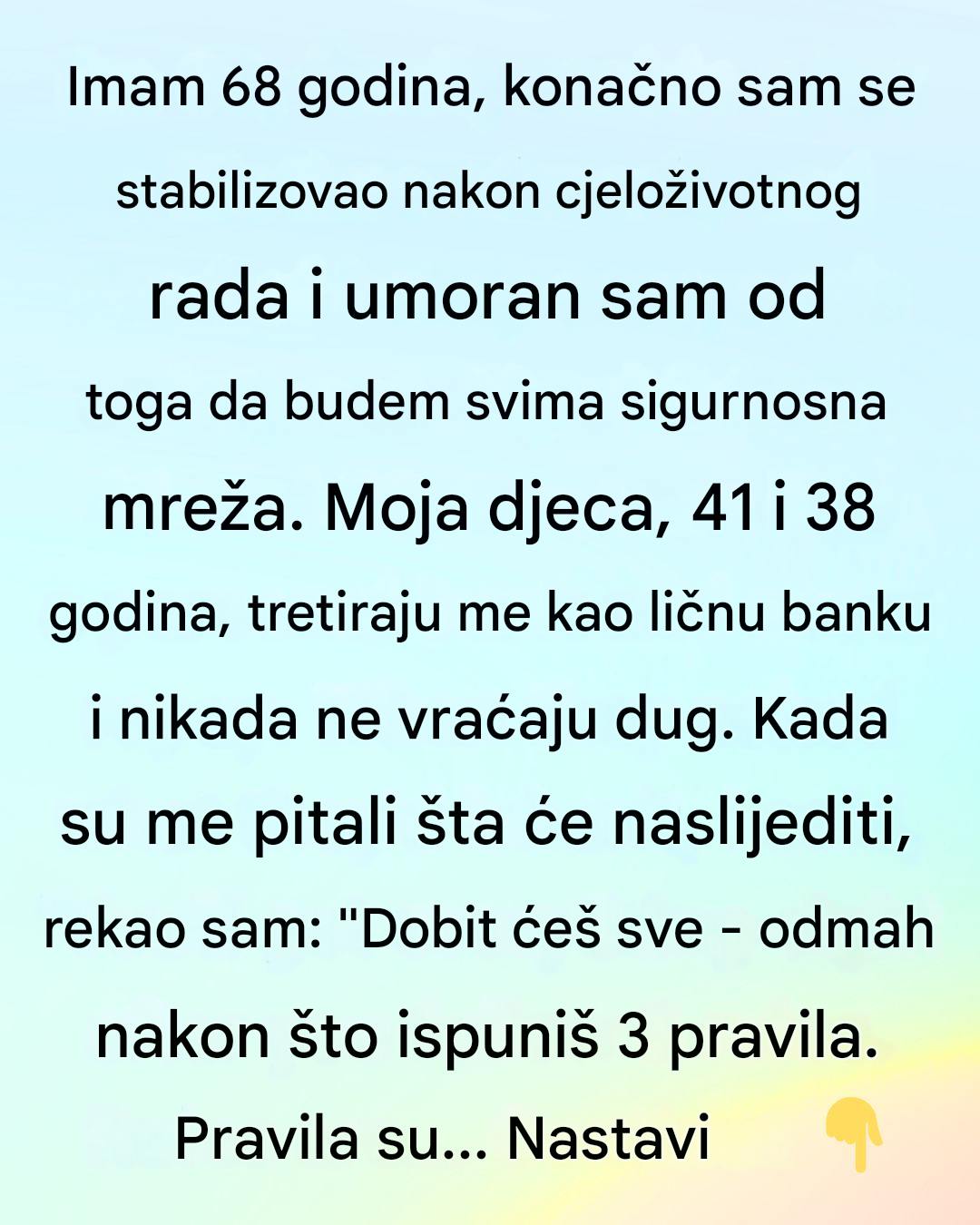 - Jednog dana, odlučila sam da postavim jasna pravila u vezi sa nasledstvom. Nakon što su se smirili i sedili za stolom, objasnila sam im ozbiljno: „Oboje ćete dobiti nasledstvo, ali samo ako ispunite tri jednostavna pravila.” Isprva su se smeštali, verujući da se šalim, ali kad su videli moj ozbiljan izraz lica, shvatili su da neću popustiti.