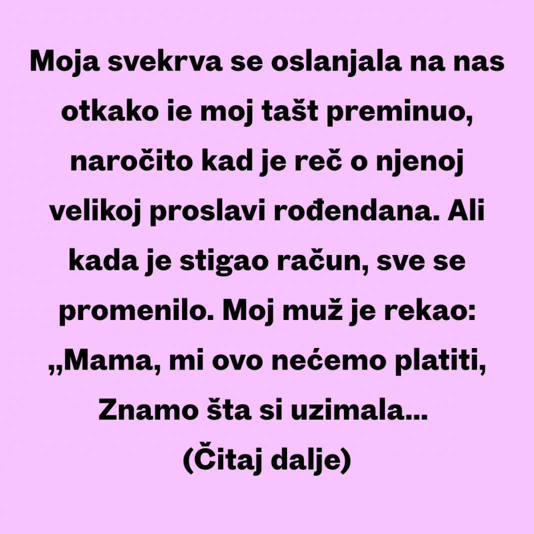 Moja svekrva je nakon smrti mog tasta postala veoma vezana za nas i oslanjala se na našu pomoć u skoro svemu. Najviše je to dolazilo do izražaja kada bi se približavali njeni rođendani, jer je insistirala na velikim i raskošnim proslavama. U početku mi se činilo da je to prirodno, da joj kao porodica pomognemo i stanemo uz nju u teškim trenucima, jer je gubitak supruga za nju bio ogroman udarac. Ali vremenom sam primetila da stvari ne idu u dobrom pravcu.