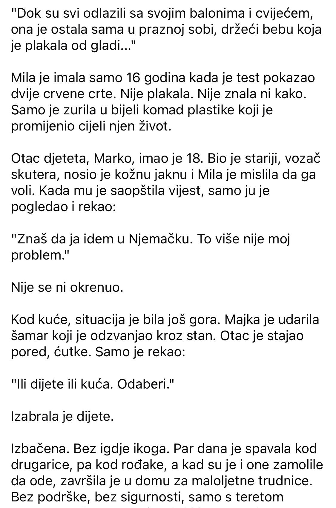 - Kada je otišla kući, situacija je bila još gora. Majka ju je udarila šamarom, dok je otac ćutke stajao pored. Jedino što je rekao bilo je: “Ili dijete, ili kuća. Odaberi.” Mila je izabrala dete, ali to je značilo da će biti izbačena. Bez ijedne osobe koja bi je podržala, prvo je nekoliko dana spavala kod prijateljice, zatim kod rođake, a na kraju je završila u domu za maloljetne trudnice. Bila je sama, bez ikakve sigurnosti, sa ogromnom odgovornošću koju je nosila na svojim krhkim ramenima.
