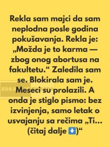 U tom trenutku, bila je u potrazi za utehom. Verovala je da bi razgovor s majkom mogao doneti barem malo olakšanja, neku reč podrške. Ipak, majčina reakcija bila je sve osim podrške. Umesto da joj pruži rame za plakanje, majka je odgovorila rečenicom koja je duboko pogodila. „Pa, možda je to karma zbog onog abortusa na fakultetu. Život ima način da nas nauči lekcijama.“ Reči koje su dolazile od osobe koja bi trebalo da je voli i podrži bile su oštre, hladne, gotovo kao optužba.