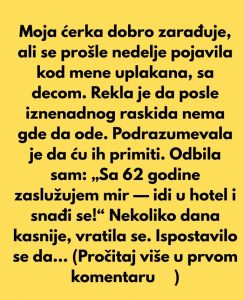 Ta spoznaja je bila poput hladnog tuša. Majka je shvatila da vrata nije zatvorila pred haosom, već pred sopstvenim detetom u najranjivijem trenutku. Razlozi koji su joj tada delovali opravdano sada su zvučali prazno i sitno. Tepih, san, tišina — sve to odjednom nije imalo nikakvu težinu.