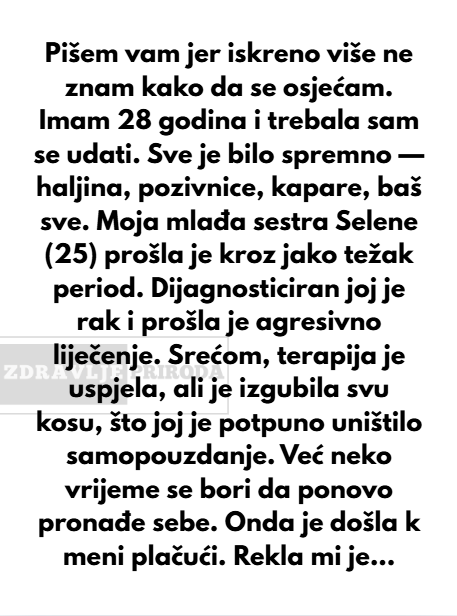 - Kada si saznala da je tvoja sestra zakazala svoje vjenčanje u isto vrijeme kada si ti odgodila svoje, to je bilo kao dodatni udarac. To što ti je rekla da je ona to “više zaslužila” jer je prošla kroz bolest, dok si ti bila zdrava, dodatno je povrijedilo tvoje osjećaje. Njena reakcija pokazuje da možda nije potpuno shvatila koliko ti to znači. Tvoj bijes i osjećaj nepravde su potpuno razumljivi.