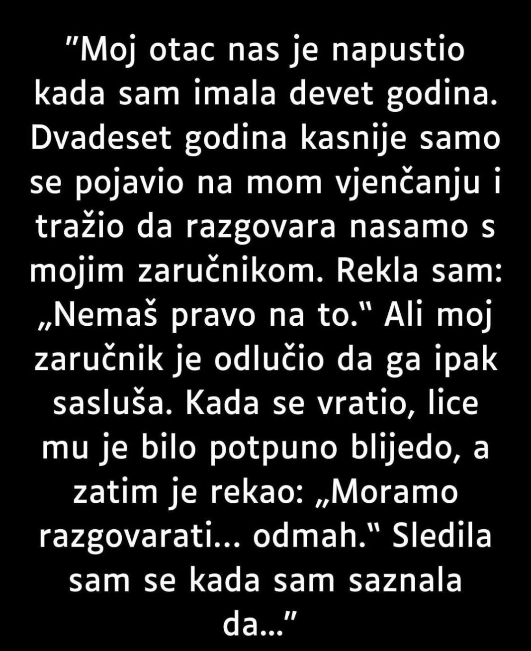 - Tada, dvadeset godina nakon što je otišao, moj otac se vratio. I to baš na mom vjenčanju. Taj trenutak, kada je zakoračio u prostoriju prepunu mojih gostiju, bio je potpuno šokantan. Nisam imala pojma što se događa. Iako sam bila zbunjena, osjećala sam kako se u meni budi lavina osjećaja. Pitanja su izbijala u mojoj glavi: Zašto je sada došao? Što ga je motiviralo da se vrati? Bilo je previše toga da bih mogla razumjeti. Najveće iznenađenje nije bilo samo njegovo iznenadno pojavljivanje, nego i ono što mi je potom rekao.