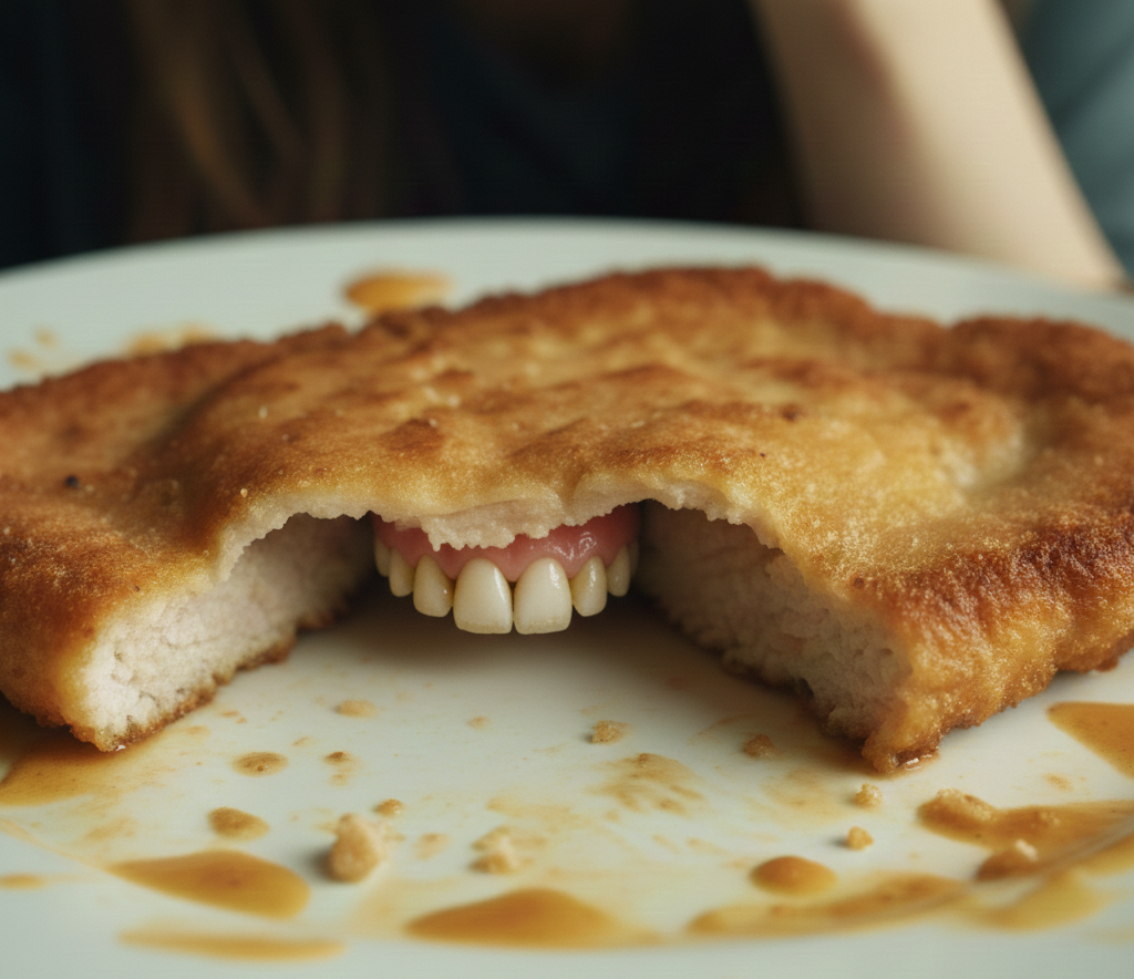 Dok sam se spremao da zagrizem komad šnicle, osjetio sam nešto što nije bilo kao obično. Nešto tvrdo, nešto što nije pripadalo hrskavici ili začinima. Pogledao sam pažljivo i vidio sam to – protezu. Proteza u mesu. Na trenutak sam pomislio da možda haluciniram, ali nisam mogao da verujem svojim očima. Kako je moguće da se proteza, nešto što ne bi smelo da bude u hrani, našla u ovom obroku? Srce mi je preskočilo, a osećaj nelagodnosti i gađenja momentalno je obuzeo moje telo. U tom trenutku, ništa nije imalo smisla.