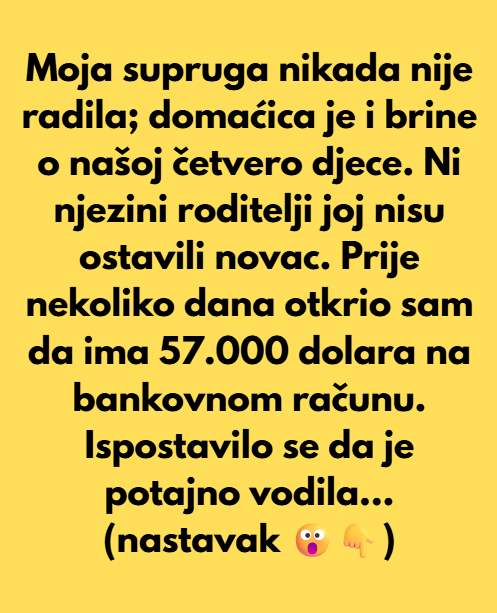 Moja supruga nikada nije imala posao u klasičnom smislu te reči. Bila je posvećena kući, brinula se o našem domu i našoj četvoro dece, obavljala sve one svakodnevne, nevidljive zadatke koje većina ljudi i ne primeti. Njeni roditelji nisu ostavili nasledstvo niti neki imetak, pa sam godinama verovao da zavisi isključivo od mene. Međutim, pre nekoliko dana sam otkrio nešto što me je potpuno zateklo i promenilo način na koji je doživljavam. Pronašao sam dokaz da na svom bankovnom računu ima preko pedeset sedam hiljada dolara. Bio sam šokiran. Nisam mogao da shvatim kako je do toga došla, s obzirom na to da nikada nije imala primanja.