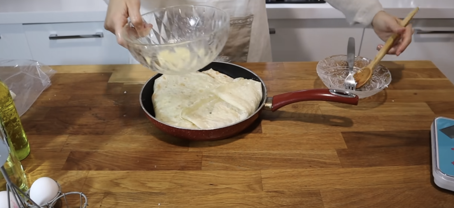 Način slaganja u tavi je ono što ovaj recept čini jedinstvenim. Tava se najprije naulji, a zatim se kore raspoređuju tako da rubovima prekrivaju dno. Dio nadjeva stavlja se odmah po kori, a zatim se kore kidaju, gužvaju i umaču u smjesu kako bi upile tečnost i ravnomjerno rasporedile sir. Kada se sve složi, krajevi kora koji vise preko ivica tave preklapaju se preko bureka i na kraju se cijelo jelo premaže ostatkom nadjeva. Tako se dobija slojevita, sočna struktura koja se lijepo zapeče kada se poklopljena tava stavi na vatru.