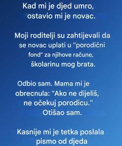 Ova priča nas podseća da ponekad najveći darovi koje možemo dobiti nisu materijalne stvari, već unutrašnja snaga i poverenje koje dobijemo od voljenih.Kada je moj deda preminuo, ostavio mi je određenu sumu novca, koja je na prvi pogled izgledala kao običan deo porodične imovine. Međutim, priča se nije završila na tom materijalu. Odluka o tome šta učiniti s tim novcem promenila je moj pogled na život, moju porodicu i vlastite želje.
