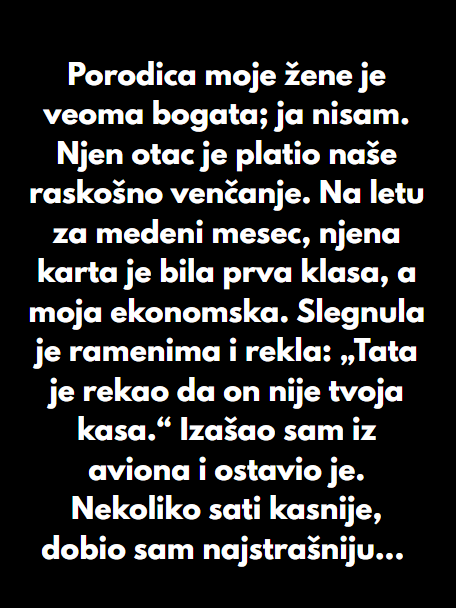Okrenula se prema njemu sa blagim osmijehom i rekla: „Bezveze, dušo… ali tata kaže da nije tvoja kasa.” Te reči su ga pogodile dublje nego što je mogao da pretpostavi. Osećao je snažan val poniženja i besa. Zatečen, znao je da nije u njegovoj prirodi da reaguje impulsivno, ali ponos mu nije dozvoljavao da ostane. Tiho je okrenuo leđa i napustio avion, ostavljajući svoju suprugu zbunjenu i samu.