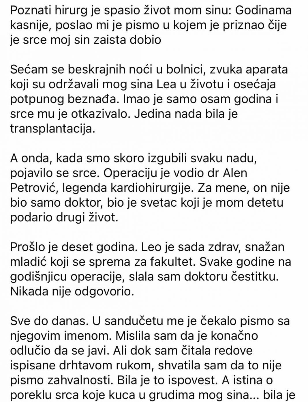 Bilo je to pismo od doktora Petrovića, sada već penzionisanog čoveka. Njegov rukopis odmah je prepoznala. Očekivala je nekoliko toplih reči, ali umesto toga, pronašla je ispovest dugu tri strane. „Vi me smatrate herojem, a ja sam čovek koji nosi greh koji se ne može oprostiti“, stajalo je na početku. U daljim redovima otkrivao je tajnu koju je nosio godinama: srce koje je kucalo u grudima njenog sina nije pripadalo nepoznatom donoru, već njegovom sopstvenom sinu Filipu.