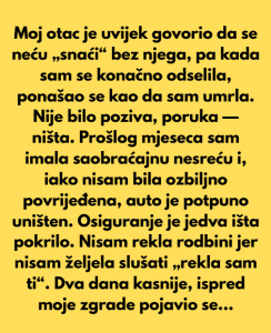 Odluka da napustim roditeljski dom bila je teška. Otišla sam bez puno razgovora, spakovala stvari i zatvorila vrata svoje stare sobe. U tom trenutku sam znala da se moj život mijenja zauvijek. Otac nije puno govorio, samo je prešao u tišinu koja je bila teža od bilo kakve rečenice. Ta tišina je bila teža nego što sam mogla zamisliti i, kako su dani prolazili, osjećala sam se kao da sam izbrisana iz njihovih života. Nije bilo poziva, poruka ili bilo kakve brige. Iako nisam to željela priznati, počela sam se pitati da li sam ih razočarala.