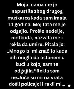 Iako je vreme prolazilo, ona nikada nije prestala da misli o majci. I onda, nakon toliko godina, iznenada je zazvonio telefon. Nepoznat broj. Kada je podigla slušalicu, čula je glas koji je poznavao, ali ga nije odmah prepoznala. To je bila njena mama. Rekla je da je bolesna, da umire. I tada je usledilo nešto što ju je šokiralo – majka ju je zamolila da poslednje dane provede u kući u kojoj je odrasla. Kuća koju su podelili sa ocem, kuća u kojoj su plakali zbog njenog odlaska, ni u kom slučaju nije bila njena više. Bilo je to suočavanje s prošlošću i bolom koji je bio duboko zakopan. Odgovor je bio jednostavan: „Ne mogu.“