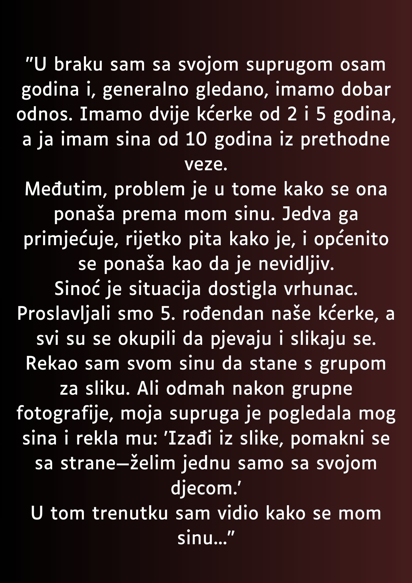 Moja supruga je, nakon što je slika napravljena, jednostavno pogledala mog sina i rekla: “Izadji sa slike, pomakni se malo sa strane, želim sliku samo sa svojom djecom.” Taj trenutak mi je slomio srce. Možda se to čini kao sitnica, ali za mog sina to je bilo teško iskustvo. Bio sam svjestan da je u tom trenutku osjećao kao da nije dovoljno dobar, da nije „pravi član porodice“.