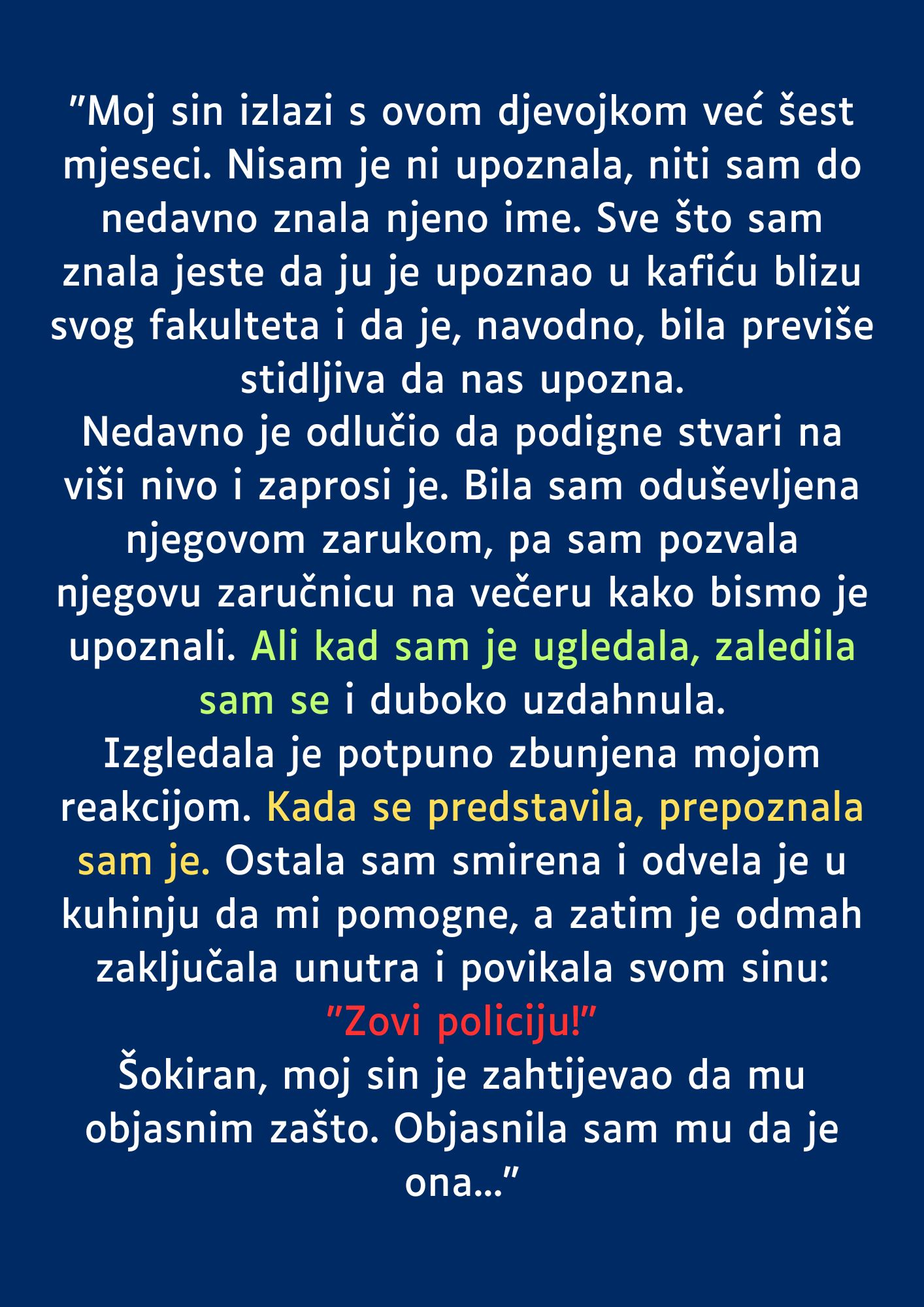 Nedavno je njen sin zaprosio svoju devojku, a kao majka, bila je presrećna. Želela je da sve bude savršeno, pa je pozvala buduću snahu na večeru, kako bi se svi bolje upoznali. Radost zbog sinovih zaruka u trenutku je bila preokrenuta kad je ona, ni kriva ni dužna, ušla u njihov dom. Majka je prepoznala tu devojku, i to joj je izazvalo veliku uznemirenost. Taj prepoznavanje je bilo izuzetno snažno, jer je ona smatrala da je devojka u pitanju prevarantica. U trenutku je donela odluku – pozvala je je u kuhinju, zaključala je i tražila od sina da odmah pozove policiju.