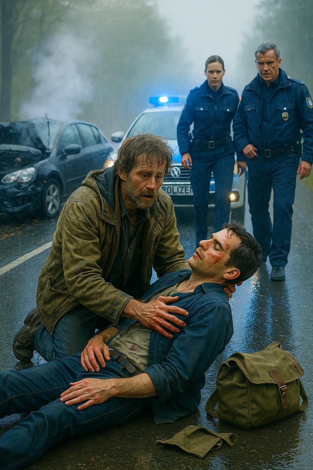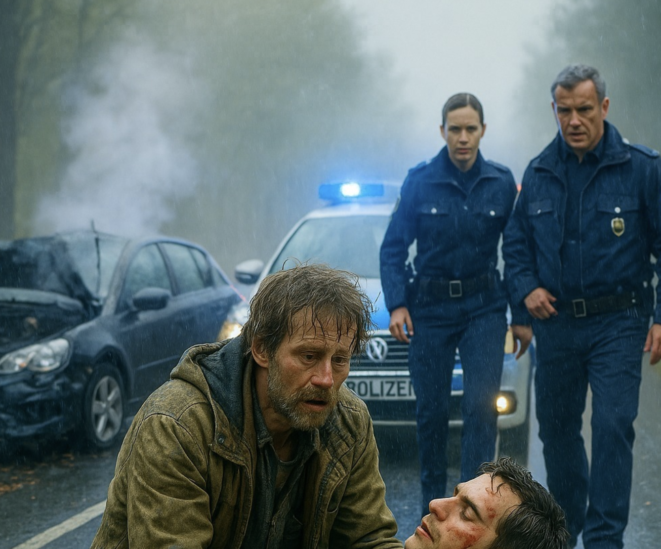 Automobili su i dalje prolazili. Neki su usporavali da vide šta se dešava, neki su samo trubili i nastavljali dalje, ali niko se nije zaustavljao da pomogne. Tek nekoliko minuta kasnije pojavila se policijska patrola. Zvuk sirena odjekivao je kroz maglu dok su se približavali.
