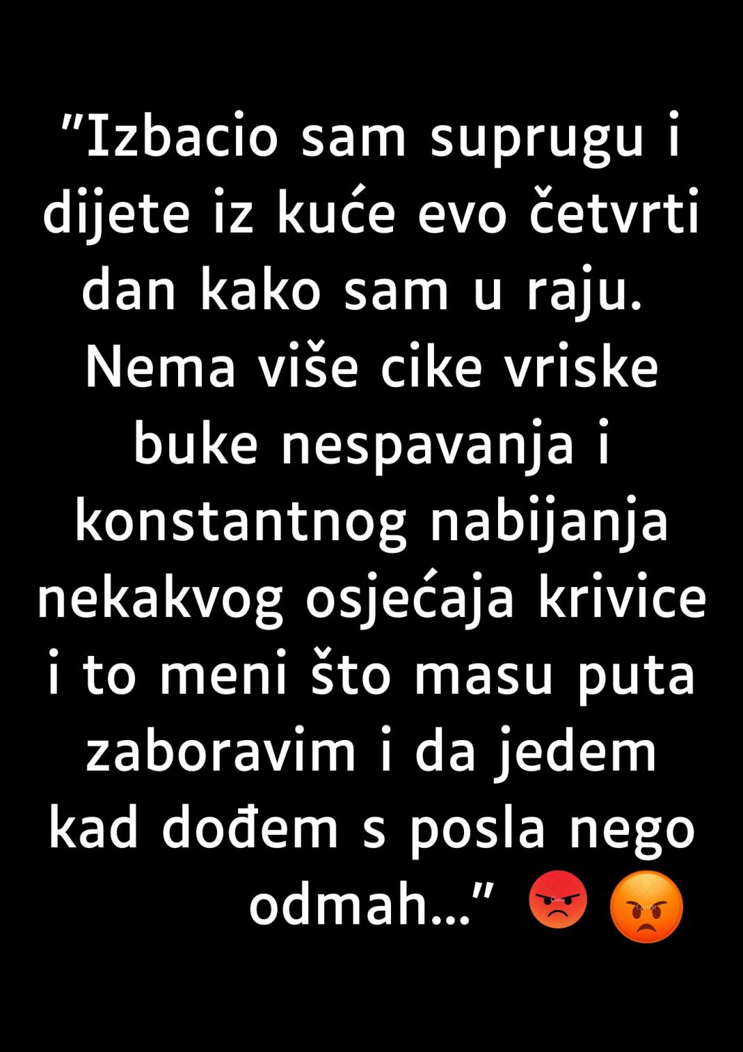 On otvoreno priznaje da je suprugu i dijete izbacio iz kuće i da se, kako kaže, već četvrti dan osjeća kao da živi u raju. U njegovim riječima nema kolebanja, nema žaljenja, već samo snažan osjećaj olakšanja. Tvrdi da mu je sada toliko lijepo da mu je to gotovo nevjerovatno, kao da je tek sada shvatio kako život može izgledati kada je, barem iz njegove perspektive, tiši i jednostavniji.