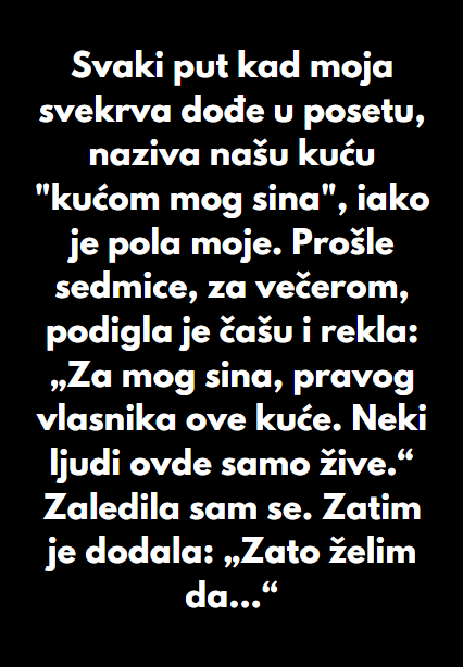 - Osetila sam kako mi raste pritisak. Pogledala sam oko sebe, čekajući da neko reaguje, da moj muž ili neko od prisutnih nešto kaže, ali niko nije reagovao. U tom trenutku nisam mogla da ćutim. Ustala sam, i rekla: „Ovo NIJE kuća tvog sina. Ovo je NAŠA kuća. Plaćam polovinu svega i dosta mi je da budem zanemarena. Nećeš dobiti ključ. Ako ne možeš da priznaš da je ovo naš zajednički dom, možda je najbolje da prestaneš da dolaziš uopšte.“