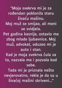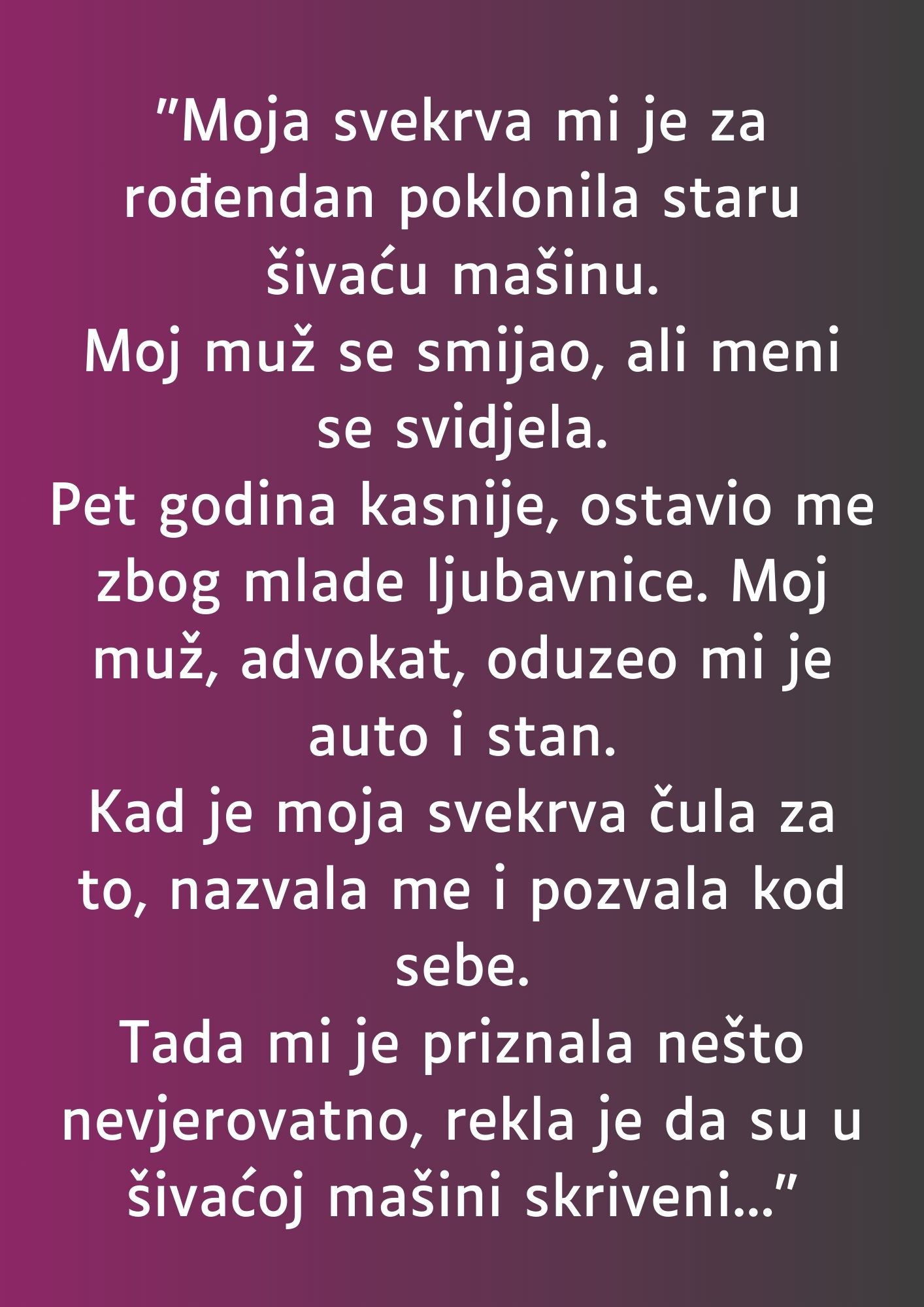 Ovo je priča o gubitku, nepravdi, ali i o snazi žene koja je pronašla izlaz iz težih trenutaka.Ova žena je doživjela duboko iznenađenje kada je od svoje svekrve dobila poklon – staru sivu šivaću mašinu. Nije bilo riječ o običnom poklonu, jer je ona bila starinska i izgledala je kao nešto što bi svaka osoba mogla smatrati neupotrebljivim.