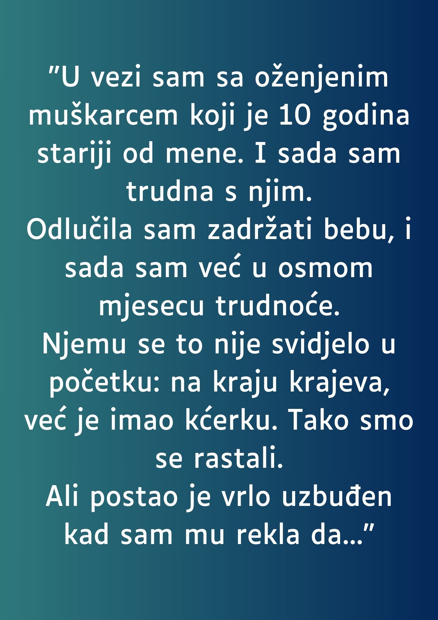 Nikada nisam zamišljala da ću se naći u ovakvoj situaciji. Bila sam u vezi sa čovekom koji je već imao porodicu, mužem i ocem, starijim od mene deset godina. Od prvog trenutka znala sam da naš odnos nosi sa sobom teret tajne i osećaj krivice, ali emocije su bile jače od razuma. Nisam razmišljala o budućnosti, o posledicama koje će neminovno doći, već sam živela u trenutku. Sve dok se nije desilo nešto što je promenilo tok mog života – ostala sam trudna.