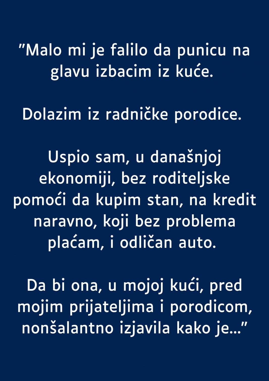 Upravo zato je, uprkos teškoj ekonomiji i brojnim preprekama, uspio da postigne finansijsku samostalnost vlastitim rukama. Kupio je stan, uredno plaćao hipoteku i obezbijedio sebi i porodici stabilan život. Nije se razmetao bogatstvom, ali je bio ponosan na ono što je stekao bez ičije pomoći.