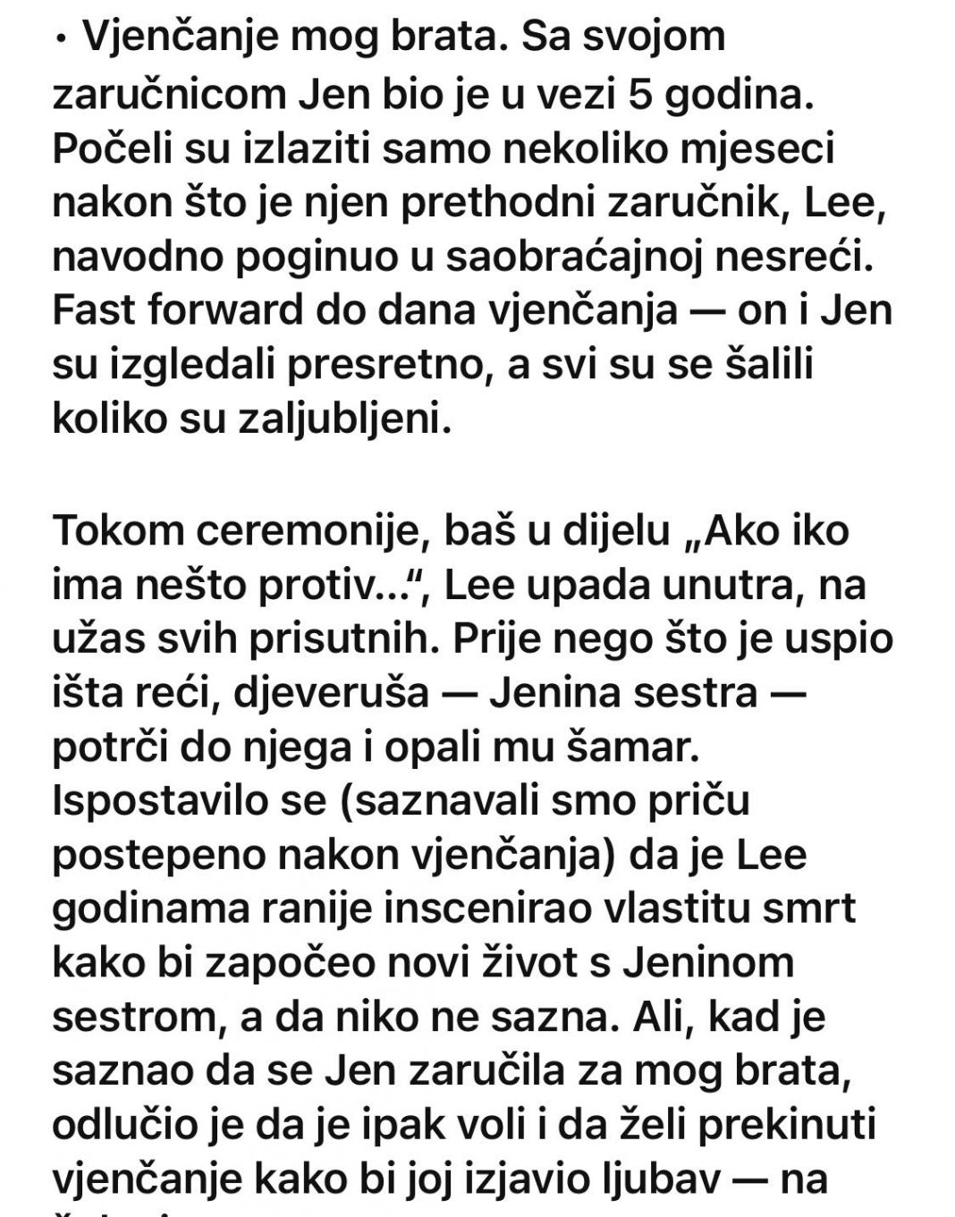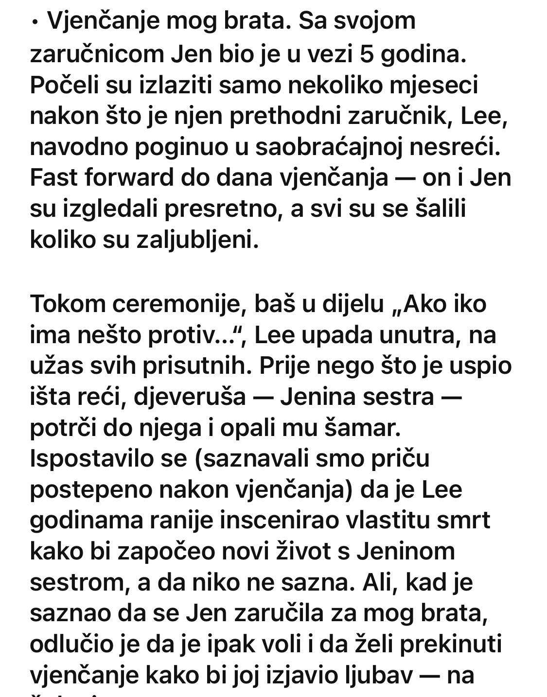 - Nakon prvobitne zapanjenosti uslijedile su rasprave, suze i duga razjašnjavanja. Jen je bila slomljena jer je saznala da je cijelo vrijeme živjela u ubijeđenju da je izgubila nekoga ko joj je tada značio. Moj brat je, uprkos svemu, stajao uz nju pokušavajući da joj pruži sigurnost. Poslije nekoliko sati haosa odlučili su da nastave s vjenčanjem, iako je atmosfera bila potpuno drugačija od one s početka dana. Ipak, njihova odluka je pokazala da su spremni da se suoče sa izazovima i da ne dozvole da prošlost diktira njihovu budućnost.