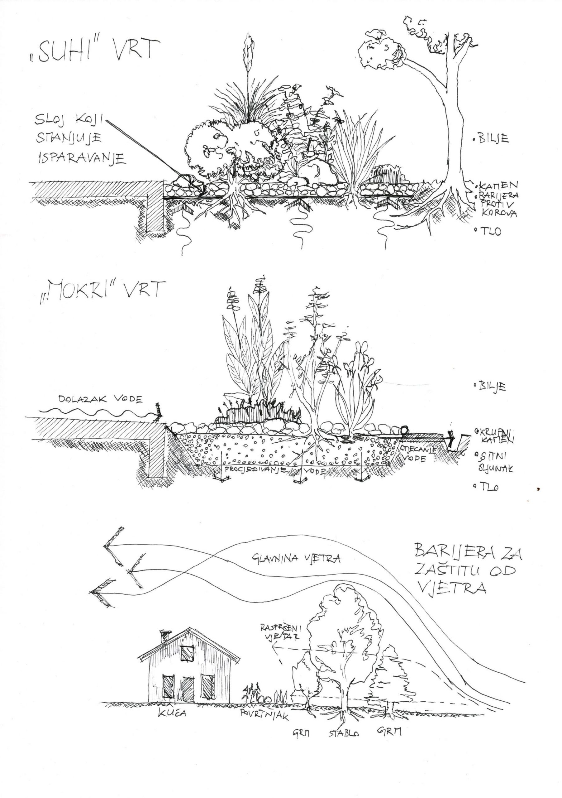 - Za suočavanje s tim problemima, potrebno je poduzeti promjene u dizajnu vrtova, kako bi postali otporniji na klimatske uvjete i smanjili potrebu za održavanjem, vodom i dodatnim ulaganjima. Jedno od rješenja koje sve više uzima maha u europskoj praksi, prema DHMZ i Climate-ADAPT, jest projektiranje vrtova s rješenjima koja su već ispitana i bazirana na dugogodišnjoj iskustvu u otpornosti na klimatske promjene. Sustavi dizajnirani za ekstremne uvjete koriste tlo koje je propusno i otporno na sušu, smanjuju isparavanje, a koriste biljke koje podnose deficit vode. Uz to, važna je i prilagodba tla za bržu infiltraciju vode i usporavanje otjecanja, što se postiže raznim barijerama i strukturama u vrtu.